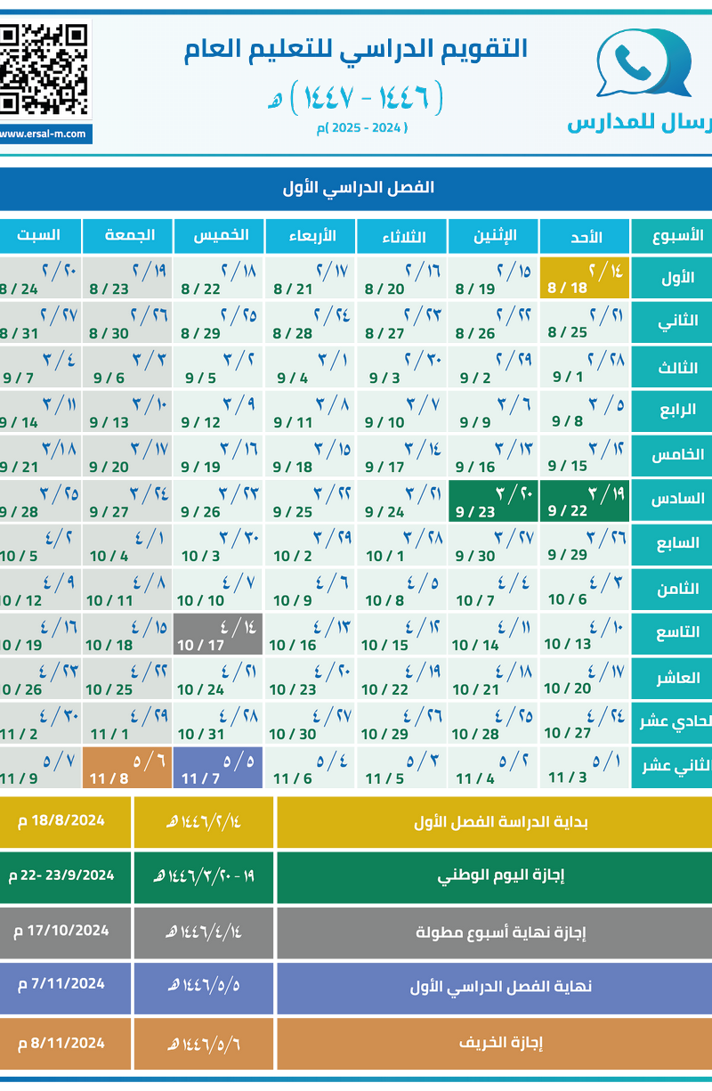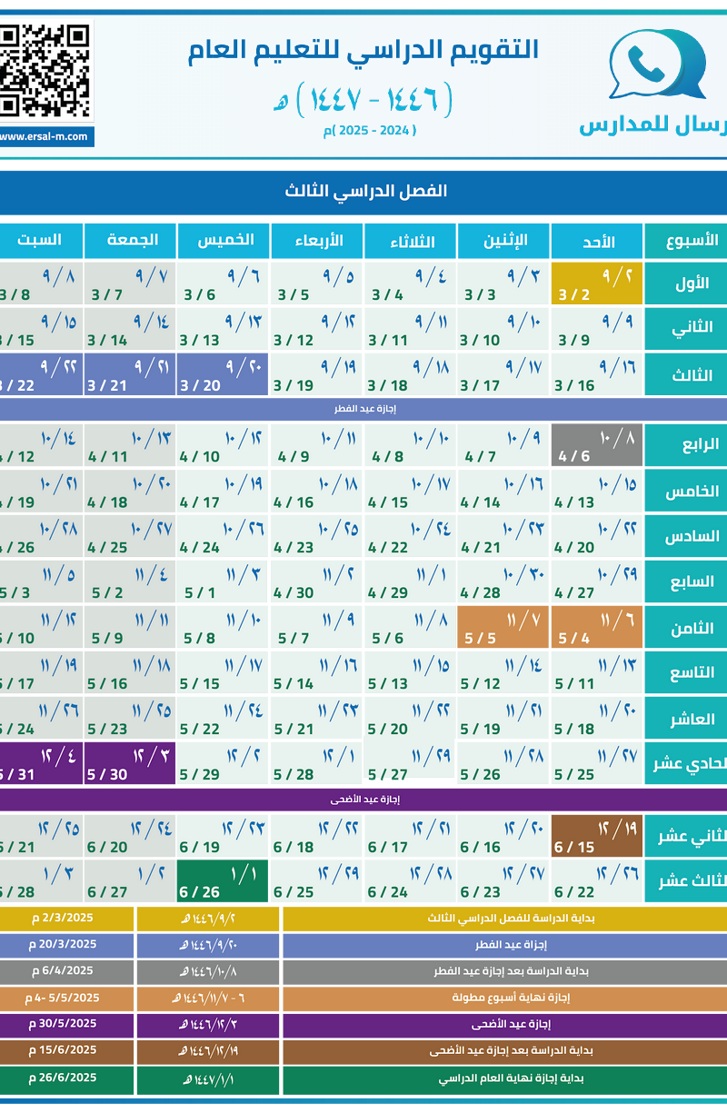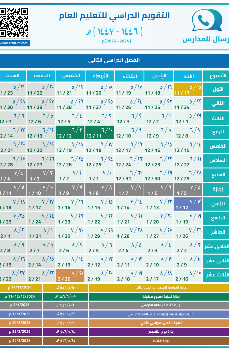 التقويم الدراسي للتعليم العام 1446هـ