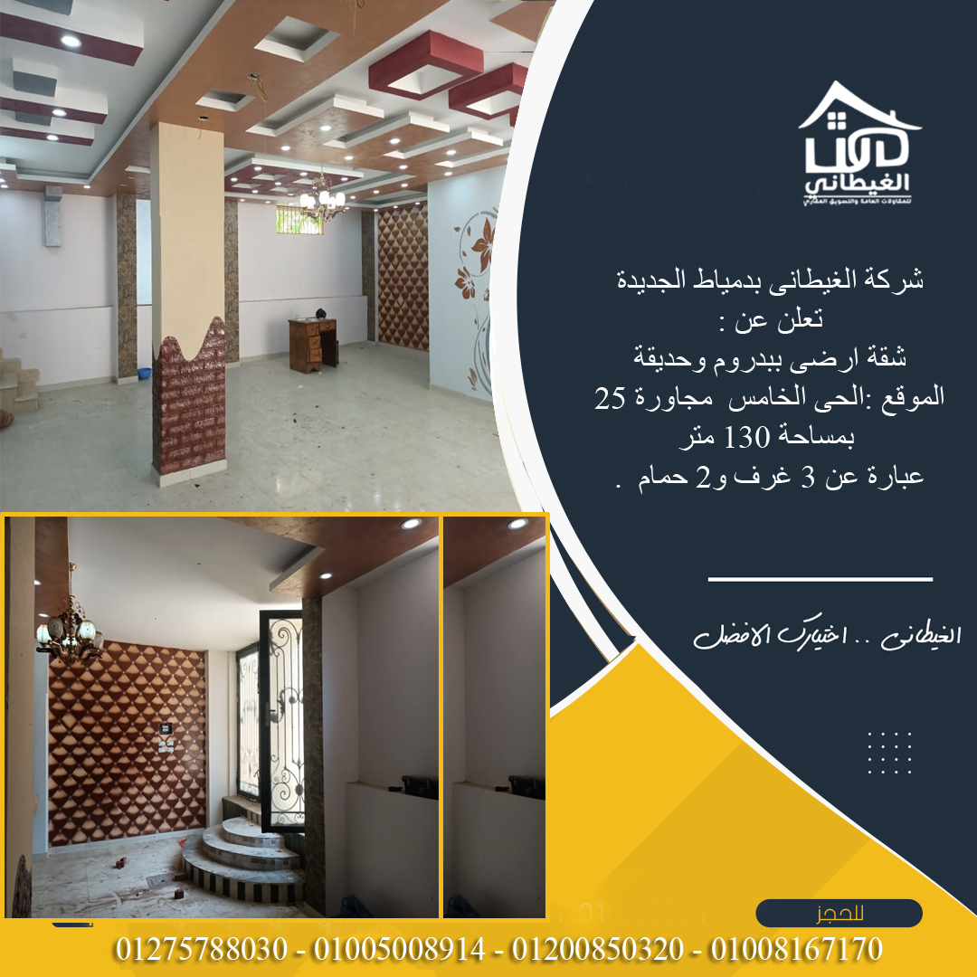 شركة الغيطانى بدمياط الجديدة تعلن عن : شقة ارضى ببدروم وحديقة الموقع :الحى الخامس مجاورة 25 بمساحة 130 متر عبارة عن 3 غرف و2 حمام . لمزيد من المعلومات 01008167170 – 01200850320 – 01005008914 – 01275788030 مليون 450 جنيه...