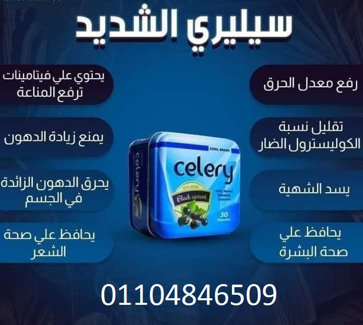سيلري الشديد مدمر الدهون الاحدث والاقوي على سد الشهية وحرق الدهون العنيدة والمخزونة بالجسم سيلرى من اقوي واحدث منتجات شركة زوريل الالمانية الكبسولة الجبارة في قفل الشهية وتفتيت الدهون كبسولات سيلرى الجديدة للتخسيس celery يعتبر احدث واقوى منتجات التخسيس والذي يتكون من منتجات طبيعية تماما وأمنة وغير ضارة يعمل على انقاص الوزن بدون أي آثار جانبية بسبب التركيبة الفريدة للسيطرة علي الشهية المفرطة ورفع معدلات حرق الدهون المخزنة. قفل الشهية والسيطرة عليها لمدة كبيرة تصل حتى 8 ساعات متواصل لبعض الاجسام ورفع معدلات الحرق باهلاك الالاف الكالوريز بدون نشاط رياضى مكونات كبسولات سيلرى celery يتكون سيلرى للتخسيس على 150 سعر حراري خالي من الدهون والكوليسترول. كما يحتوي على 32 من الكربوهيدرات بما فى ذلك 1 جرام من الألياف الغذائية و30 جرام من السكريات العبوة تحتوى30كبسولة الجرعة اليومية لكبسولات سيلرى كبسولة كل يوم قبل الافطار بنصف ساعة