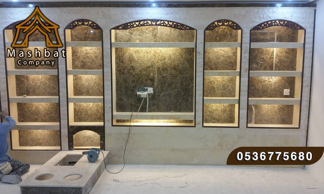 مشبات بواجهة رخامية مع أرفف جانبية مضاءة للديكور.